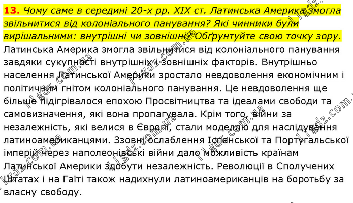 Чому саме в середині 20-х рр. XIX ст. Латинська Америка змогла звільнитися від колоніального панування? Які чинники були вирішальними: внутрішні чи зовнішні? Обґрунтуйте свою точку зору. Латинська Америка змогла звільнитися від колоніального панування завдяки сукупності внутрішніх і зовнішніх факторів. Внутрішньо населення Латинської Америки зростало невдоволення економічним і політичним гнітом колоніального панування. Це невдоволення ще більше підігрівалося епохою Просвітництва та ідеалами свободи та самовизначення, які вона пропагувала. Крім того, війни за незалежність, які велися в Європі, стали моделлю для наслідування латиноамериканцями. Ззовні ослаблення Іспанської та Португальської імперій через наполеонівські війни дало можливість країнам Латинської Америки здобути незалежність. Революції в Сполучених Штатах і на Гаїті також надихнули латиноамериканців на боротьбу за власну свободу.