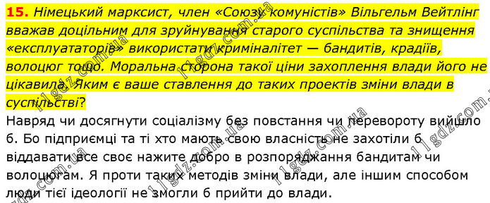 Німецький марксист, член «Союзу комуністів» Вільгельм Вейтлінг вважав доцільним для зруйнування старого суспільства та знищення «експлуататорів» використати криміналітет — бандитів, крадіїв, волоцюг тощо. Моральна сторона такої ціни захоплення влади його не цікавила. Яким є ваше ставлення до таких проектів зміни влади в суспільстві? Навряд чи досягнути соціалізму без повстання чи перевороту вийшло б. Бо підприємці та ті хто мають свою власність не захотіли б віддавати все своє нажите добро в розпоряджання бандитам чи волоцюгам. Я проти таких методів зміни влади, але іншим способом люди тієї ідеології не змогли б прийти до влади.
