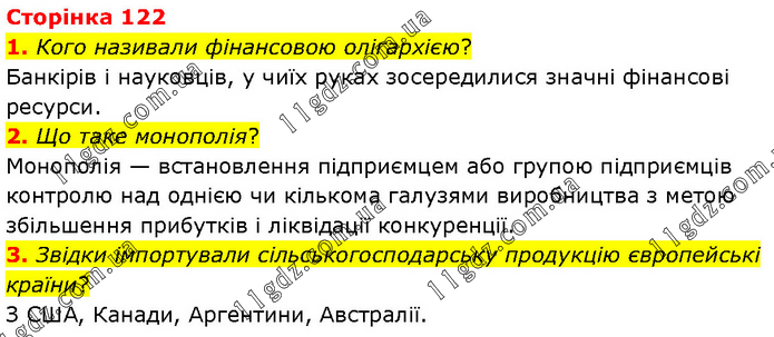 1. Кого називали фінансовою олігархією? Банкірів і науковців, у чиїх руках зосередилися значні фінансові ресурси. 2. Що таке монополія? Монополія — встановлення підприємцем або групою підприємців контролю над однією чи кількома галузями виробництва з метою збільшення прибутків і ліквідації конкуренції. 3. Звідки імпортували сільськогосподарську продукцію європейські країни? З США, Канади, Аргентини, Австралії.