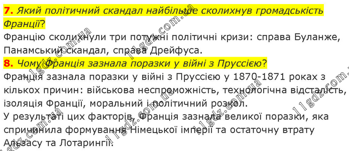 7. Який політичний скандал найбільше сколихнув громадськість Франції? Францію сколихнули три потужні політичні кризи: справа Буланже, Панамський скандал, справа Дрейфуса. 8. Чому Франція зазнала поразки у війні з Пруссією? Франція зазнала поразки у війні з Пруссією у 1870-1871 роках з кількох причин: військова неспроможність, технологічна відсталість, ізоляція Франції, моральний і політичний розкол. У результаті цих факторів, Франція зазнала великої поразки, яка спричинила формування Німецької імперії та остаточну втрату Альзасу та Лотарингії.
