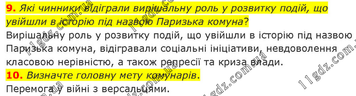 9. Які чинники відіграли вирішальну роль у розвитку подій, що увійшли в історію під назвою Паризька комуна? Вирішальну роль у розвитку подій, що увійшли в історію під назвою Паризька комуна, відігравали соціальні ініціативи, невдоволення класовою нерівністю, а також репресії та криза влади. 10. Визначте головну мету комунарів. Перемога у війні з версальцями.