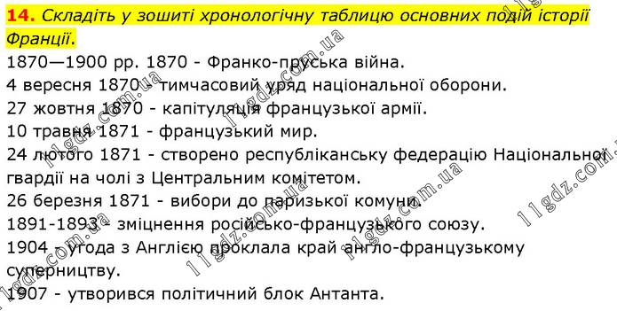 Складіть у зошиті хронологічну таблицю основних подій історії Франції. 1870—1900 рр. 1870 - Франко-пруська війна. 4 вересня 1870 - тимчасовий уряд національної оборони. 27 жовтня 1870 - капітуляція французької армії. 10 травня 1871 - французький мир. 24 лютого 1871 - створено республіканську федерацію Національної гвардії на чолі з Центральним комітетом. 26 березня 1871 - вибори до паризької комуни. 1891-1893 - зміцнення російсько-французького союзу. 1904 - угода з Англією проклала край англо-французькому суперництву. 1907 - утворився політичний блок Антанта.