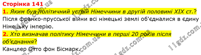 1. Яким був політичний устрій Німеччини в другій половині XIX ст.? Після франко-прусської війни всі німецькі землі об'єдналися в єдину Німецьку імперію. 2. Хто визначав політику Німеччини в перші 20 років після об’єднання? Канцлер Отто фон Бісмарк.