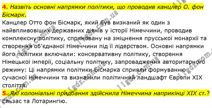 4. Назвіть основні напрямки політики, що проводив канцлер О. фон Бісмарк. Канцлер Отто фон Бісмарк, який був визнаний як один з найвпливовіших державних діячів у історії Німеччини, проводив комплексну політику, спрямовану на зміцнення прусської монархії та створення об'єднаної Німеччини під її лідерством. Основні напрямки його політики включали: консервативну політику, створення Німецької імперії, соціальну політику, запровадження авторитарного режиму: Ці напрямки політики Бісмарка сприяли формуванню сучасної Німеччини та визначили політичний ландшафт Європи XIX століття. 5. Які колоніальні придбання здійснила Німеччина наприкінці XIX ст.? Ельзас та Лотарингію.