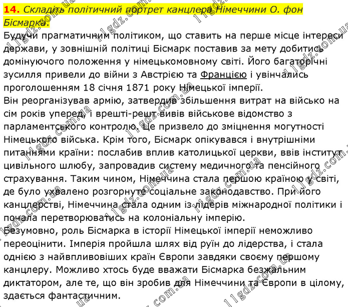 Складіть політичний портрет канцлера Німеччини О. фон Бісмарка. Будучи прагматичним політиком, що ставить на перше місце інтереси держави, у зовнішній політиці Бісмарк поставив за мету добитись домінуючого положення у німецькомовному світі. Його багаторічні зусилля привели до війни з Австрією та Францією і увінчались проголошенням 18 січня 1871 року Німецької імперії. Він реорганізував армію, затвердив збільшення витрат на військо на сім років уперед, і врешті-решт вивів військове відомство з парламентського контролю. Це призвело до зміцнення могутності Німецького війська. Крім того, Бісмарк опікувався і внутрішніми питаннями країни: послабив вплив католицької церкви, ввів інститут цивільного шлюбу, запровадив систему медичного та пенсійного страхування. Таким чином, Німеччина стала першою країною у світі, де було ухвалено розгорнуте соціальне законодавство. При його канцлерстві, Німеччина стала одним із лідерів міжнародної політики і почала перетворюватись на колоніальну імперію. Безумовно, роль Бісмарка в історії Німецької імперії неможливо переоцінити. Імперія пройшла шлях від руїн до лідерства, і стала однією з найвпливовіших країн Європи завдяки своєму першому канцлеру. Можливо хтось буде вважати Бісмарка безжальним диктатором, але те, що він зробив для Німеччини та Європи в цілому, здається фантастичним.