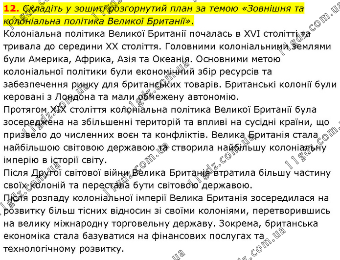 Складіть у зошиті розгорнутий план за темою «Зовнішня та колоніальна політика Великої Британії». Колоніальна політика Великої Британії почалась в XVI столітті та тривала до середини XX століття. Головними колоніальними землями були Америка, Африка, Азія та Океанія. Основними метою колоніальної політики були економічний збір ресурсів та забезпечення ринку для британських товарів. Британські колонії були керовані з Лондона та мали обмежену автономію. Протягом XIX століття колоніальна політика Великої Британії була зосереджена на збільшенні територій та впливі на сусідні країни, що призвело до численних воєн та конфліктів. Велика Британія стала найбільшою світовою державою та створила найбільшу колоніальну імперію в історії світу. Після Другої світової війни Велика Британія втратила більшу частину своїх колоній та перестала бути світовою державою. Після розпаду колоніальної імперії Велика Британія зосередилася на розвитку більш тісних відносин зі своїми колоніями, перетворившись на велику міжнародну торговельну державу. Зокрема, британська економіка стала базуватися на фінансових послугах та технологічному розвитку.