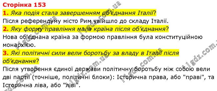 1. Яка подія стала завершенням об’єднання Італії? Після референдуму місто Рим увійшло до складу Італії. 2. Яку форму правління мала країна після об’єднання? Нова об'єднана країна за формою правління була конституційною монархією. 3. Які політичні сили вели боротьбу за владу в Італії після об’єднання? Після утворення єдиної держави політичну боротьбу між собою вели дві партії (точніше, політичні блоки): Історична права, або "праві", та Історична ліва, або "ліві".