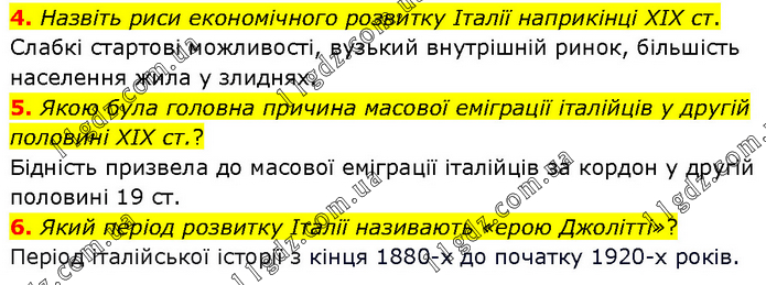 4. Назвіть риси економічного розвитку Італії наприкінці XIX ст. Слабкі стартові можливості, вузький внутрішній ринок, більшість населення жила у злиднях. 5. Якою була головна причина масової еміграції італійців у другій половині XIX ст.? Бідність призвела до масової еміграції італійців за кордон у другій половині 19 ст. 6. Який період розвитку Італії називають «ерою Джолітті»? Період італійської історії з кінця 1880-х до початку 1920-х років.