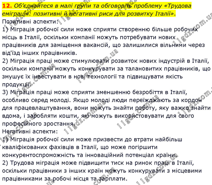 Об’єднайтеся в малі групи та обговоріть проблему «Трудова еміграція: позитивні й негативні риси для розвитку Італії». Позитивні аспекти: 1) Міграція робочої сили може сприяти створенню більше робочих місць в Італії, оскільки компанії можуть потребувати нових працівників для заміщення вакансій, що залишилися вільними через від'їзд інших працівників. 2) Міграція праці може стимулювати розвиток нових індустрій в Італії, оскільки компанії можуть конкурувати за талановитих працівників, що змушує їх інвестувати в нові технології та підвищувати якість продукції. 3) Міграція праці може сприяти зменшенню безробіття в Італії, особливо серед молоді. Якщо молоді люди переїжджають за кордон для працевлаштування, вони можуть знайти роботу, яку важко знайти вдома, і заробляти кошти, які можуть використовувати для свого професійного зростання. Негативні аспекти: 1) Міграція робочої сили може призвести до втрати найбільш кваліфікованих фахівців в Італії, що може погіршити конкурентоспроможність та інноваційний потенціал країни. 2) Трудова міграція може підвищити тиск на ринок праці в Італії, оскільки працівники з інших країн можуть конкурувати з місцевими працівниками за робочі місця та зарплати.