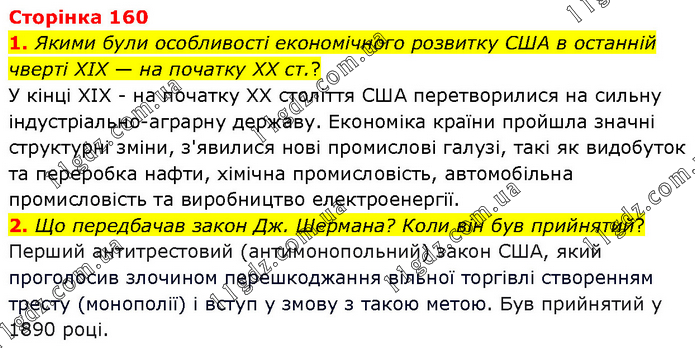 1. Якими були особливості економічного розвитку США в останній чверті XIX — на початку XX ст.? У кінці XIX - на початку XX століття США перетворилися на сильну індустріально-аграрну державу. Економіка країни пройшла значні структурні зміни, з'явилися нові промислові галузі, такі як видобуток та переробка нафти, хімічна промисловість, автомобільна промисловість та виробництво електроенергії. 2. Що передбачав закон Дж. Шермана? Коли він був прийнятий? Перший антитрестовий (антимонопольний) закон США, який проголосив злочином перешкоджання вільної торгівлі створенням тресту (монополії) і вступ у змову з такою метою. Був прийнятий у 1890 році.