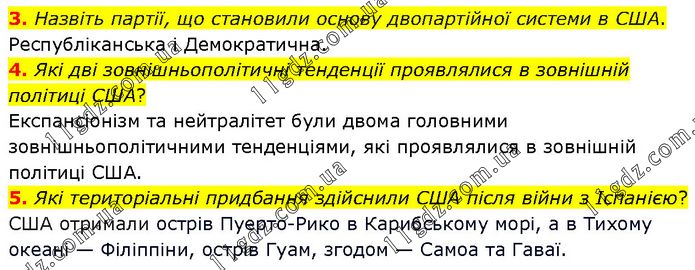 3. Назвіть партії, що становили основу двопартійної системи в США. Республіканська і Демократична. 4. Які дві зовнішньополітичні тенденції проявлялися в зовнішній політиці США? Експансіонізм та нейтралітет були двома головними зовнішньополітичними тенденціями, які проявлялися в зовнішній політиці США. 5. Які територіальні придбання здійснили США після війни з Іспанією? США отримали острів Пуерто-Рико в Карибському морі, а в Тихому океані — Філіппіни, острів Гуам, згодом — Самоа та Гаваї.