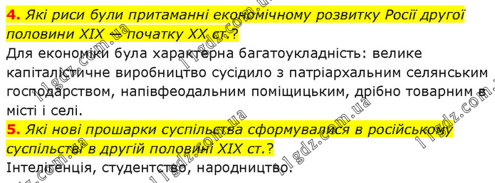 4. Які риси були притаманні економічному розвитку Росії другої половини XIX — початку XX ст.? Для економіки була характерна багатоукладність: велике капіталістичне виробництво сусідило з патріархальним селянським господарством, напівфеодальним поміщицьким, дрібно товарним в місті і селі. 5. Які нові прошарки суспільства сформувалися в російському суспільстві в другій половині XIX ст.? Інтелігенція, студентство, народництво.