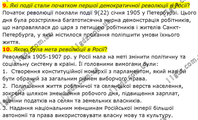 9. Які події стали початком першої демократичної революції в Росії? Початок революції поклали події 9(22) січня 1905 у Петербурзі. Цього дня була розстріляна багатотисячна мирна демонстрація робітників, що направлялася до царя з петицією робітників і жителів Санкт-Петербурга, у якій містилося прохання поліпшити умови їхнього життя. 10. Якою була мета революції в Росії? Революція 1905-1907 рр. у Росії мала на меті змінити політичну та соціальну систему в країні. Її головними вимогами були: 1. Створення конституційної монархії з парламентом, який мав би бути обраний за загальним рівнем виборчого права. 2. Поліпшення життя робітничої та селянської верств населення, зокрема шляхом зменшення робочого дня, підвищення зарплат, відміни податків на селян та земельних власників. 3. Надання національним меншинам Російської імперії більшої автономії та права використовувати власну мову та культуру.