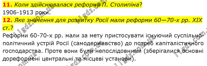 11. Коли здійснювалася реформа П. Столипіна? 1906-1913 роки. 12. Яке значення для розвитку Росії мали реформи 60—70-х рр. XIX ст.? Реформи 60-70-х рр. мали за мету пристосувати існуючий суспільно-політичний устрій Росії (самодержавство) до потреб капіталістичного господарства. Проте вони були непослідовними (зберігалися основні дореформені центральні та місцеві установи).
