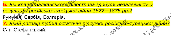 6. Які країни Балканського півострова здобули незалежність у результаті російсько-турецької війни 1877—1878 рр.? Румунія, Сербія, Болгарія. 7. Який договір підбив остаточні підсумки російсько-турецької війни? Сан-Стефанський.