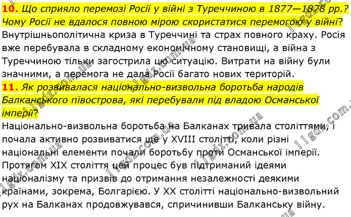 10. Що сприяло перемозі Росії у ¬війні з Туреччиною в 1877—1878 рр.? Чому Росії не вдалося повною мірою скористатися перемогою у війні? Внутрішньополітична криза в Туреччині та страх повного краху. Росія вже перебувала в складному економічному становищі, а війна з Туреччиною тільки загострила цю ситуацію. Витрати на війну були значними, а перемога не дала Росії багато нових територій. 11. Як розвивалася національно-визвольна боротьба народів Балканського півострова, які перебували під владою Османської імперії? Національно-визвольна боротьба на Балканах тривала століттями, і почала активно розвиватися ще у XVIII столітті, коли різні національні елементи почали боротьбу проти Османської імперії. Протягом XIX століття цей процес був підтриманий ідеями націоналізму та призвів до отримання незалежності деякими країнами, зокрема, Болгарією. У XX столітті національно-визвольний рух на Балканах продовжувався, спричинивши Балканську війну.