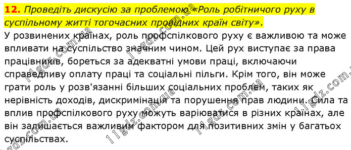 Проведіть дискусію за проблемою «Роль робітничого руху в суспільному житті тогочасних провідних країн світу». У розвинених країнах, роль профспілкового руху є важливою та може впливати на суспільство значним чином. Цей рух виступає за права працівників, бореться за адекватні умови праці, включаючи справедливу оплату праці та соціальні пільги. Крім того, він може грати роль у розв'язанні більших соціальних проблем, таких як нерівність доходів, дискримінація та порушення прав людини. Сила та вплив профспілкового руху можуть варіюватися в різних країнах, але він залишається важливим фактором для позитивних змін у багатьох суспільствах.