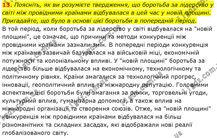 Поясніть, як ви розумієте твердження, що боротьба за лідерство у світі між провідними країнами відбувалася в цей час у новій площині. Пригадайте, що було в основі цієї боротьби в попередній період. В той період, коли боротьба за лідерство у світі відбувалася на "новій площині", це означає, що причини та методи конкуренції між провідними країнами зазнали змін. В попередні періоди конкуренція між країнами зазвичай базувалася на військовій міці, економічній потужності та колоніальному впливі. У "новій площині" боротьба за лідерство більше відбувалася на економічному, технологічному та політичному рівнях. Країни змагалися за технологічний прогрес, інновації, геополітичний вплив та міжнародну репутацію. Головними аспектами цієї боротьби були змагання за ринки, торговельні угоди, культурний вплив, гуманітарна допомога, а також вплив на міжнародні організації та створення союзів. Отже, на "новій площині" конкуренція між провідними країнами відбувалася на більш різноманітних та складних засадах, які відображали нові реалії глобалізованого світу.