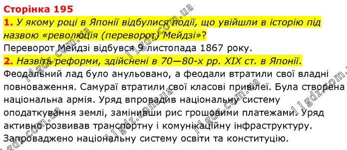 1. У якому році в Японії відбулися події, що увійшли в історію під назвою «революція (переворот) Мейдзі»? Переворот Мейдзі відбувся 9 листопада 1867 року. 2. Назвіть реформи, здійснені в 70—80-х рр. XIX ст. в Японії. Феодальний лад було анульовано, а феодали втратили свої владні повноваження. Самураї втратили свої класові привілеї. Була створена національна армія. Уряд впровадив національну систему оподаткування землі, замінивши рис грошовими платежами. Уряд активно розвивав транспортну і комунікаційну інфраструктуру. Запроваджено національну систему освіти та конституцію.