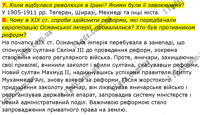 7. Коли відбулася революція в Ірані? Якими були її завоювання? У 1905-1911 рр. Тегеран, Ширазі, Мехмеді та інші міста. 8. Чому в XIX ст. спроби здійснити реформи, які передбачали європеїзацію Османської імперії, провалилися? Хто був противником реформ? На початку XIX ст. Османська імперія перебувала в занепаді, що спонукало султана Селіма III до проведення реформ, зокрема створення нового регулярного війська. Проте, яничари, захищаючи свої привілеї, вчинили заколот і вбили султана, скасувавши реформи. Новий султан Махмуд II, надихнувшись успіхами правителя Єгипту Мухаммеда Алі, знову взявся за реформи. Після жорстокого придушення заколоту яничар, він ліквідував яничарське військо і реорганізував державний апарат, запровадив систему міністерств і новий адміністративний поділ. Важливою реформою стало запровадження приватного права на землю.