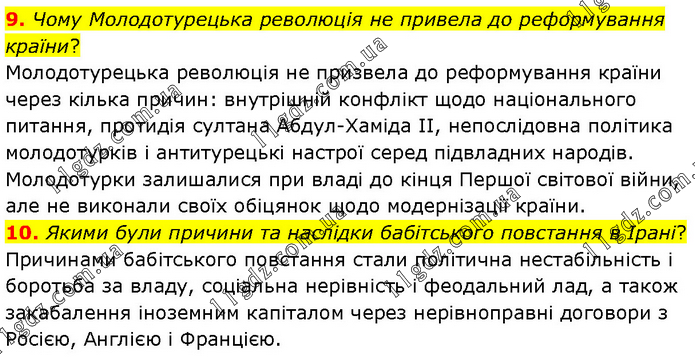 9. Чому Молодотурецька революція не привела до реформування країни? Молодотурецька революція не призвела до реформування країни через кілька причин: внутрішній конфлікт щодо національного питання, протидія султана Абдул-Хаміда II, непослідовна політика молодотурків і антитурецькі настрої серед підвладних народів. Молодотурки залишалися при владі до кінця Першої світової війни, але не виконали своїх обіцянок щодо модернізації країни. 10. Якими були причини та наслідки бабітського повстання в Ірані? Причинами бабітського повстання стали політична нестабільність і боротьба за владу, соціальна нерівність і феодальний лад, а також закабалення іноземним капіталом через нерівноправні договори з Росією, Англією і Францією.