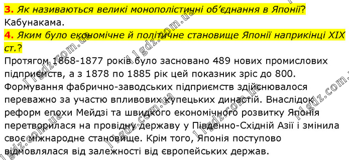 3. Як називаються великі монополістичні об’єднання в Японії? Кабунакама. 4. Яким було економічне й політичне становище Японії наприкінці XIX ст.? Протягом 1868-1877 років було засновано 489 нових промислових підприємств, а з 1878 по 1885 рік цей показник зріс до 800. Формування фабрично-заводських підприємств здійснювалося переважно за участю впливових купецьких династій. Внаслідок реформ епохи Мейдзі та швидкого економічного розвитку Японія перетворилася на провідну державу у Південно-Східній Азії і змінила своє міжнародне становище. Крім того, Японія поступово відмовлялася від залежності від європейських держав.
