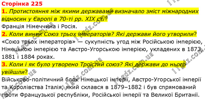 1. Протистояння між якими державами визначало зміст міжнародних відносин у Європі в 70-ті рр. XIX ст.? Франція Німеччина і Росія. 2. Коли виник Союз трьох імператорів? Які держави його утворили? «Союз трьох імператорів» — сукупність угод між Російською імперією, Німецькою імперією та Австро-Угорською імперією, укладених в 1873, 1881 і 1884 роках. 3. Коли і як було утворено Троїстий союз? Які держави до нього увійшли? Військово-політичний блок Німецької імперії, Австро-Угорської імперії та Королівства Італія, який склався в 1879–1882 і був спрямований проти Французької республіки, Російської імперії та Великої Британії.