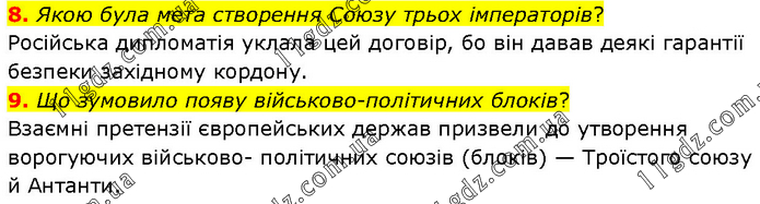 8. Якою була мета створення Союзу трьох імператорів? Російська дипломатія уклала цей договір, бо він давав деякі гарантії безпеки західному кордону. 9. Що зумовило появу військово-політичних блоків? Взаємні претензії європейських держав призвели до утворення ворогуючих військово- політичних союзів (блоків) — Троїстого союзу й Антанти.