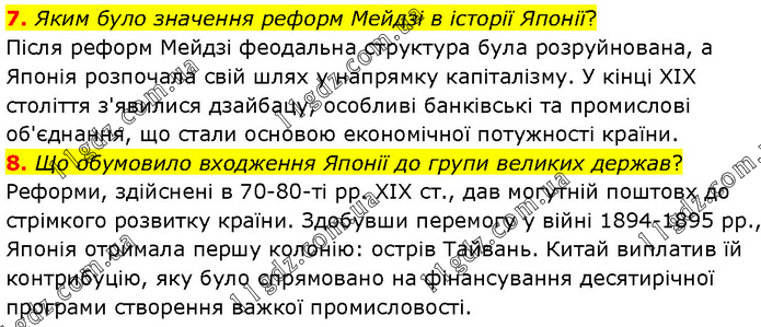 7. Яким було значення реформ Мейдзі в історії Японії? Після реформ Мейдзі феодальна структура була розруйнована, а Японія розпочала свій шлях у напрямку капіталізму. У кінці XIX століття з'явилися дзайбацу, особливі банківські та промислові об'єднання, що стали основою економічної потужності країни. 8. Що обумовило входження Японії до групи великих держав? Реформи, здійснені в 70-80-ті рр. XIX ст., дав могутній поштовх до стрімкого розвитку країни. Здобувши перемогу у війні 1894-1895 рр., Японія отримала першу колонію: острів Тайвань. Китай виплатив їй контрибуцію, яку було спрямовано на фінансування десятирічної програми створення важкої промисловості.