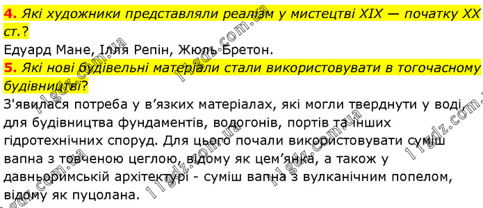 4. Які художники представляли реалізм у мистецтві XIX — початку ХХ ст.? Едуард Мане, Ілля Репін, Жюль Бретон. 5. Які нові будівельні матеріали стали використовувати в тогочасному будівництві? З'явилася потреба у в’язких матеріалах, які могли тверднути у воді, для будівництва фундаментів, водогонів, портів та інших гідротехнічних споруд. Для цього почали використовувати суміш вапна з товченою цеглою, відому як цем’янка, а також у давньоримській архітектурі - суміш вапна з вулканічним попелом, відому як пуцолана.
