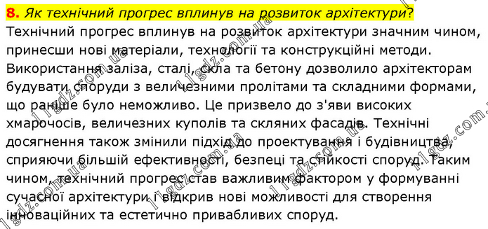Як технічний прогрес вплинув на розвиток архітектури? Технічний прогрес вплинув на розвиток архітектури значним чином, принесши нові матеріали, технології та конструкційні методи. Використання заліза, сталі, скла та бетону дозволило архітекторам будувати споруди з величезними пролітами та складними формами, що раніше було неможливо. Це призвело до з'яви високих хмарочосів, величезних куполів та скляних фасадів. Технічні досягнення також змінили підхід до проектування і будівництва, сприяючи більшій ефективності, безпеці та стійкості споруд. Таким чином, технічний прогрес став важливим фактором у формуванні сучасної архітектури і відкрив нові можливості для створення інноваційних та естетично привабливих споруд.
