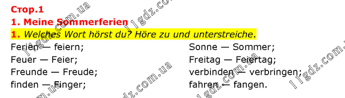 1. Meine Sommerferien 1. Welches Wort hörst du? Höre zu und unterstreiche. Ferien — feiern; Feuer — Feier; Freunde — Freude; finden — Finger; Sonne — Sommer; Freitag — Feiertag; verbinden — verbringen; fahren — fangen.