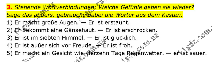 3. Stehende Wortverbindungen: Welche Gefühle geben sie wieder? Sage das anders, gebrauche dabei die Wörter aus dem Kasten. 1) Er macht große Augen. — Er ist erstaunt. 2) Er bekommt eine Gänsehaut. — Er ist erschrocken. 3) Er ist im siebten Himmel. — Er ist glücklich. 4) Er ist außer sich vor Freude. — Er ist froh. 5) Er macht ein Gesicht wie vierzehn Tage Regenwetter. — er ist sauer.
