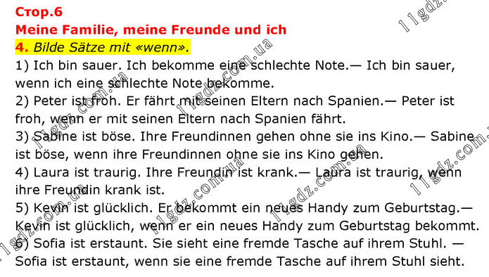 Meine Familie, meine Freunde und ich 4. Bilde Sätze mit «wenn». 1) Ich bin sauer. Ich bekomme eine schlechte Note.— Ich bin sauer, wenn ich eine schlechte Note bekomme. 2) Peter ist froh. Er fährt mit seinen Eltern nach Spanien.— Peter ist froh, wenn er mit seinen Eltern nach Spanien fährt. 3) Sabine ist böse. Ihre Freundinnen gehen ohne sie ins Kino.— Sabine ist böse, wenn ihre Freundinnen ohne sie ins Kino gehen. 4) Laura ist traurig. Ihre Freundin ist krank.— Laura ist traurig, wenn ihre Freundin krank ist. 5) Kevin ist glücklich. Er bekommt ein neues Handy zum Geburtstag.— Kevin ist glücklich, wenn er ein neues Handy zum Geburtstag bekommt. 6) Sofia ist erstaunt. Sie sieht eine fremde Tasche auf ihrem Stuhl. — Sofia ist erstaunt, wenn sie eine fremde Tasche auf ihrem Stuhl sieht.