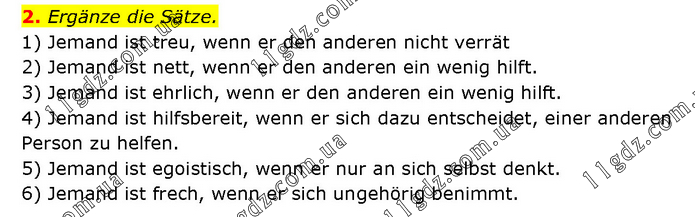 Ergänze die Sätze. 1) Jemand ist treu, wenn er den anderen nicht verrät 2) Jemand ist nett, wenn er den anderen ein wenig hilft. 3) Jemand ist ehrlich, wenn er den anderen ein wenig hilft. 4) Jemand ist hilfsbereit, wenn er sich dazu entscheidet, einer anderen Person zu helfen. 5) Jemand ist egoistisch, wenn er nur an sich selbst denkt. 6) Jemand ist frech, wenn er sich ungehörig benimmt.