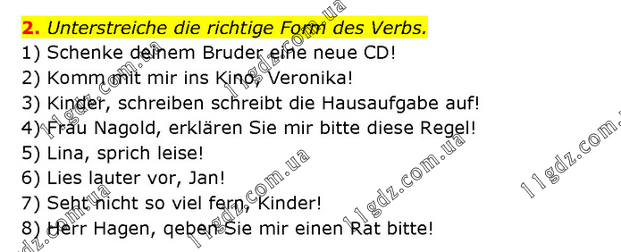 Unterstreiche die richtige Form des Verbs. 1) Schenke deinem Bruder eine neue CD! 2) Komm mit mir ins Kino, Veronika! 3) Kinder, schreiben schreibt die Hausaufgabe auf! 4) Frau Nagold, erklären Sie mir bitte diese Regel! 5) Lina, sprich leise! 6) Lies lauter vor, Jan! 7) Seht nicht so viel fern, Kinder! 8) Herr Hagen, qeben Sie mir einen Rat bitte!