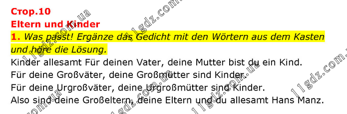 Eltern und Kinder 1. Was passt! Ergänze das Gedicht mit den Wörtern aus dem Kasten und höre die Lösung. Kinder allesamt Für deinen Vater, deine Mutter bist du ein Kind. Für deine Großväter, deine Großmütter sind Kinder. Für deine Urgroßväter, deine Urgroßmütter sind Kinder. Also sind deine Großeltern, deine Eltern und du allesamt Hans Manz.