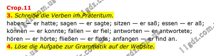 3. Schreibe die Verben im Präteritum. haben — er hatte; sagen — er sagte; sitzen — er saß; essen — er aß; können — er konnte; fallen — er fiel; antworten — er antwortete; hören — er hörte; fließen — er floss; anfangen — er find an. 4. Löse die Aufgabe zur Grammatik auf der Website.