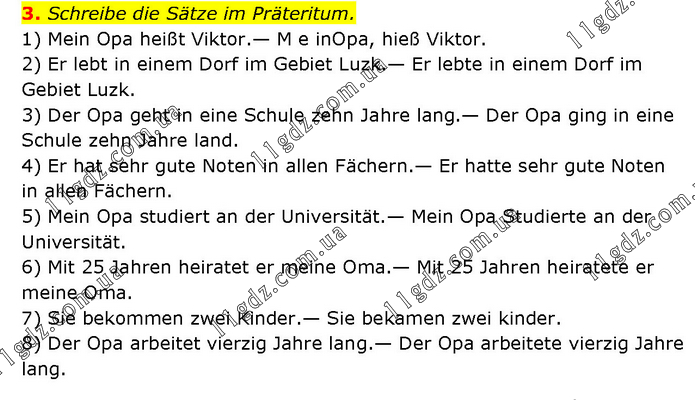 Schreibe die Sätze im Präteritum. 1) Mein Opa heißt Viktor.— M e inOpa, hieß Viktor. 2) Er lebt in einem Dorf im Gebiet Luzk.— Er lebte in einem Dorf im Gebiet Luzk. 3) Der Opa geht in eine Schule zehn Jahre lang.— Der Opa ging in eine Schule zehn Jahre land. 4) Er hat sehr gute Noten in allen Fächern.— Er hatte sehr gute Noten in allen Fächern. 5) Mein Opa studiert an der Universität.— Mein Opa Studierte an der Universität. 6) Mit 25 Jahren heiratet er meine Oma.— Mit 25 Jahren heiratete er meine Oma. 7) Sie bekommen zwei Kinder.— Sie bekamen zwei kinder. 8) Der Opa arbeitet vierzig Jahre lang.— Der Opa arbeitete vierzig Jahre lang.