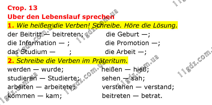 Uber den Lebenslauf sprechen 1. Wie heißen die Verben! Schreibe. Höre die Lösung. der Beitritt — beitreten; die Geburt —; die Information — ; die Promotion —; das Studium — ; die Arbeit —; 2. Schreibe die Verben im Präteritum. werden — wurde; heißen — hieß; studieren — Studierte; sehen — sah; arbeiten — arbeitete; verstehen — verstand; kommen — kam; beitreten — betrat.