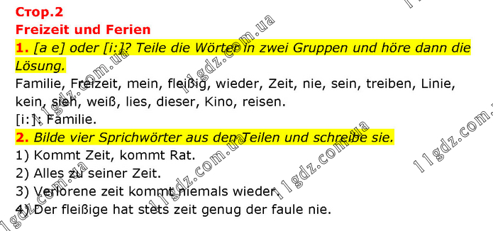 Freizeit und Ferien 1. [a e] oder [i:]? Teile die Wörter in zwei Gruppen und höre dann die Lösung. Familie, Freizeit, mein, fleißig, wieder, Zeit, nie, sein, treiben, Linie, kein, sieh, weiß, lies, dieser, Kino, reisen. [i:]: Familie. 2. Bilde vier Sprichwörter aus den Teilen und schreibe sie. 1) Kommt Zeit, kommt Rat. 2) Alles zu seiner Zeit. 3) Verlorene zeit kommt niemals wieder. 4) Der fleißige hat stets zeit genug der faule nie.