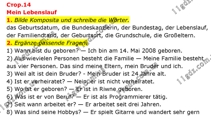 Mein Lebenslauf 1. Bilde Komposita und schreibe die Wörter. das Geburtsdatum, die Bundeskanzlerin, der Bundestag, der Lebenslauf, der Familiendtand, der Geburtsort, die Grundschule, die Großeltern. 2. Ergänze passende Fragen. 1) Wann bist du geboren? — Ich bin am 14. Mai 2008 geboren. 2) Aus wievielen Personen besteht die Familie — Meine Familie besteht aus vier Personen. Das sind meine Eltern, mein Bruder und ich. 3) Weil alt ist dein Bruder? - Mein Bruder ist 24 Jahre alt. 4) Ist er verheiratet? — Nein, er ist nicht verheiratet. 5) Wo ist er geboren? — Er ist in Riwne geboren. 6) Was ist er von Beruf? — Er ist als Programmierer tätig. 7) Seit wann arbeitet er? — Er arbeitet seit drei Jahren. 8) Was sind seine Hobbys? — Er spielt Gitarre und wandert sehr gern