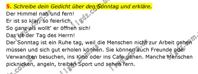 5. Schreibe dein Gedicht über den Sonntag und erkläre. Der Himmel nah und fern! Er ist so klar, so feierlich, So ganz als wollt' er öffnen sich! Das ist der Tag des Herrn! Der Sonntag ist ein Ruhe tag, weil die Menschen nicht zur Arbeit gehen müssen und sich gut erholen können. Sie können auch Freunde oder Verwandten besuchen, ins Kino oder ins Cafe gehen. Manche Menschen picknicken, angeln, treiben Sport und sehen fern.