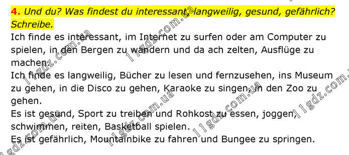Und du? Was findest du interessant, langweilig, gesund, gefährlich? Schreibe. Ich finde es interessant, im Internet zu surfen oder am Computer zu spielen, in den Bergen zu wandern und da ach zelten, Ausflüge zu machen. Ich finde es langweilig, Bücher zu lesen und fernzusehen, ins Museum zu gehen, in die Disco zu gehen, Karaoke zu singen, in den Zoo zu gehen. Es ist gesund, Sport zu treiben und Rohkost zu essen, joggen, schwimmen, reiten, Basketball spielen. Es ist gefährlich, Mountainbike zu fahren und Bungee zu springen.