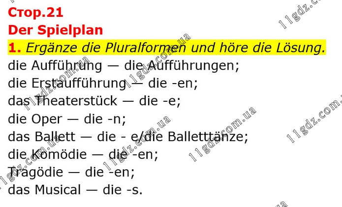 Der Spielplan 1. Ergänze die Pluralformen und höre die Lösung. die Aufführung — die Aufführungen; die Erstaufführung — die -en; das Theaterstück — die -e; die Oper — die -n; das Ballett — die - e/die Balletttänze; die Komödie — die -en; Tragödie — die -en; das Musical — die -s.