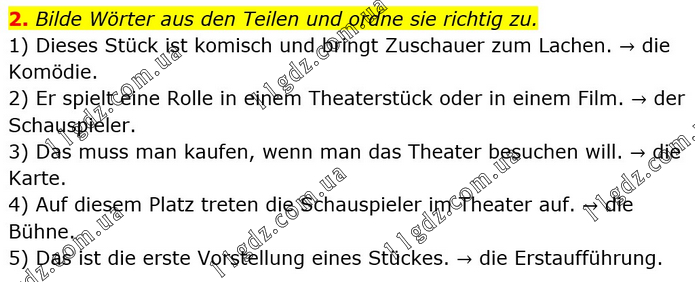 2. Bilde Wörter aus den Teilen und ordne sie richtig zu. 1) Dieses Stück ist komisch und bringt Zuschauer zum Lachen. → die Komödie. 2) Er spielt eine Rolle in einem Theaterstück oder in einem Film. → der Schauspieler. 3) Das muss man kaufen, wenn man das Theater besuchen will. → die Karte. 4) Auf diesem Platz treten die Schauspieler im Theater auf. → die Bühne. 5) Das ist die erste Vorstellung eines Stückes. → die Erstaufführung.
