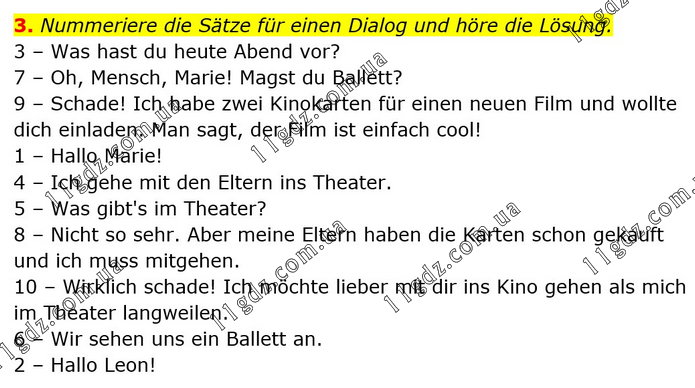 3. Nummeriere die Sätze für einen Dialog und höre die Lösung. 3 – Was hast du heute Abend vor? 7 – Oh, Mensch, Marie! Magst du Ballett? 9 – Schade! Ich habe zwei Kinokarten für einen neuen Film und wollte dich einladen. Man sagt, der Film ist einfach cool! 1 – Hallo Marie! 4 – Ich gehe mit den Eltern ins Theater. 5 – Was gibt's im Theater? 8 – Nicht so sehr. Aber meine Eltern haben die Karten schon gekauft und ich muss mitgehen. 10 – Wirklich schade! Ich möchte lieber mit dir ins Kino gehen als mich im Theater langweilen. 6 – Wir sehen uns ein Ballett an. 2 – Hallo Leon!