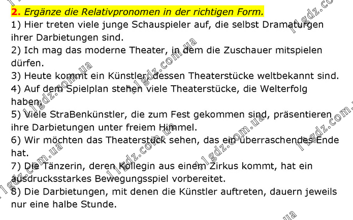2. Ergänze die Relativpronomen in der richtigen Form. 1) Hier treten viele junge Schauspieler auf, die selbst Dramaturgen ihrer Darbietungen sind. 2) Ich mag das moderne Theater, in dem die Zuschauer mitspielen dürfen. 3) Heute kommt ein Künstler, dessen Theaterstücke weltbekannt sind. 4) Auf dem Spielplan stehen viele Theaterstücke, die Welterfolg haben. 5) Viele StraBenkünstler, die zum Fest gekommen sind, präsentieren ihre Darbietungen unter freiem Himmel. 6) Wir möchten das Theaterstück sehen, das ein überraschendes Ende hat. 7) Die Tänzerin, deren Kollegin aus einem Zirkus kommt, hat ein ausdrucksstarkes Bewegungsspiel vorbereitet. 8) Die Darbietungen, mit denen die Künstler auftreten, dauern jeweils nur eine halbe Stunde.
