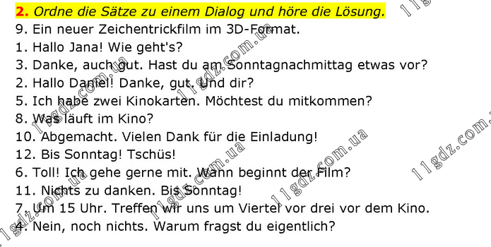 Ordne die Sätze zu einem Dialog und höre die Lösung. 9. Ein neuer Zeichentrickfilm im 3D-Format. 1. Hallo Jana! Wie geht's? 3. Danke, auch gut. Hast du am Sonntagnachmittag etwas vor? 2. Hallo Daniel! Danke, gut. Und dir? 5. Ich habe zwei Kinokarten. Möchtest du mitkommen? 8. Was läuft im Kino? 10. Abgemacht. Vielen Dank für die Einladung! 12. Bis Sonntag! Tschüs! 6. Toll! Ich gehe gerne mit. Wann beginnt der Film? 11. Nichts zu danken. Bis Sonntag! 7. Um 15 Uhr. Treffen wir uns um Viertel vor drei vor dem Kino. 4. Nein, noch nichts. Warum fragst du eigentlich?