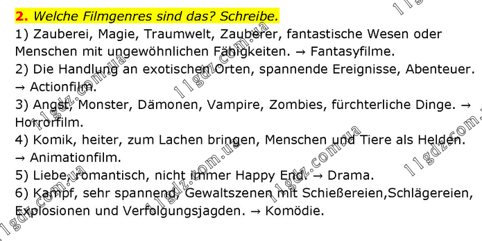 2. Welche Filmgenres sind das? Schreibe. 1) Zauberei, Magie, Traumwelt, Zauberer, fantastische Wesen oder Menschen mit ungewöhnlichen Fähigkeiten. → Fantasyfilme. 2) Die Handlung an exotischen Orten, spannende Ereignisse, Abenteuer. → Actionfilm. 3) Angst, Monster, Dämonen, Vampire, Zombies, fürchterliche Dinge. → Horrorfilm. 4) Komik, heiter, zum Lachen bringen, Menschen und Tiere als Helden. → Animationfilm. 5) Liebe, romantisch, nicht immer Happy End. → Drama. 6) Kampf, sehr spannend, Gewaltszenen mit Schießereien,Schlägereien, Explosionen und Verfolgungsjagden. → Komödie.